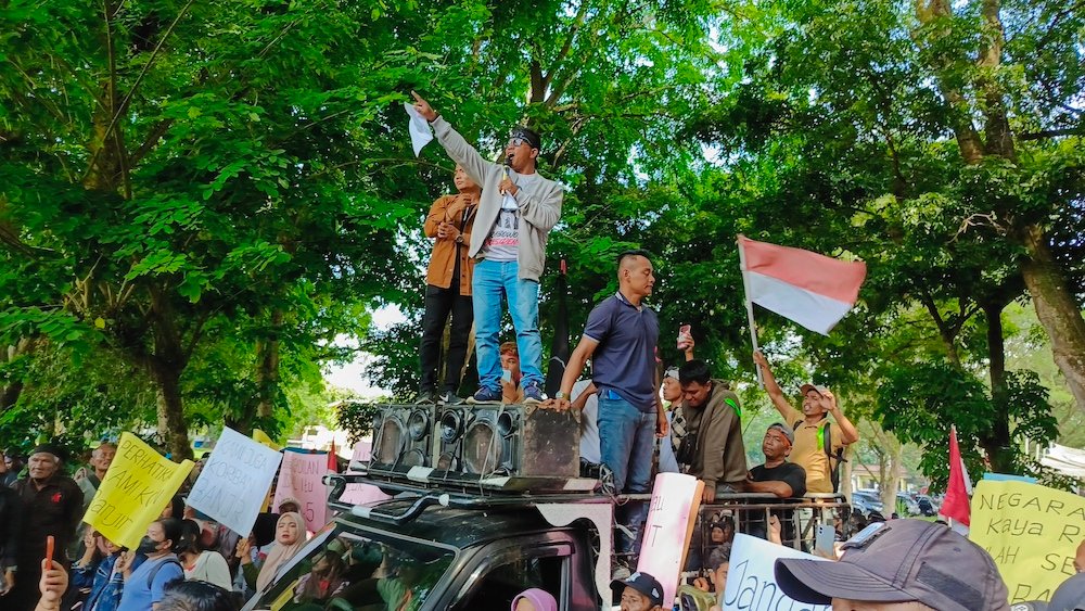Massa berorasi di depan Kantor DPRD Langkat.