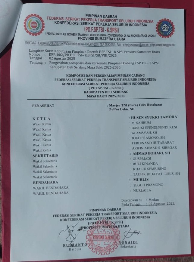 Penetapan kepengurusan tersebut tertuang dalam SK Nomor KEP.002/PD F.SP TSI-K.SPSI/SU/VIII/2025 yang berlaku sejak 2 Agustus 2025. Dalam SK itu juga tercantum komposisi lengkap pengurus, di antaranya beberapa nama yang dikenal aktif dalam gerakan buruh transportasi.
