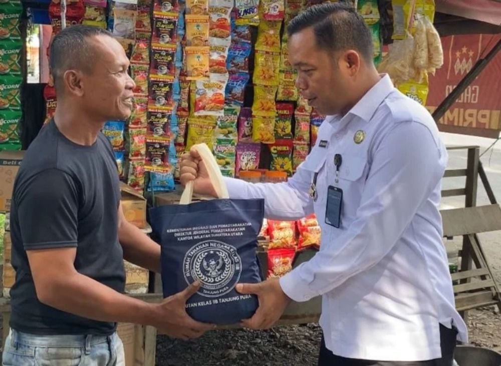 Karutan Kelas IIB Tanjung Pura Jimri Anton S Nababan memberikan paket bahan pangan kepada warga.